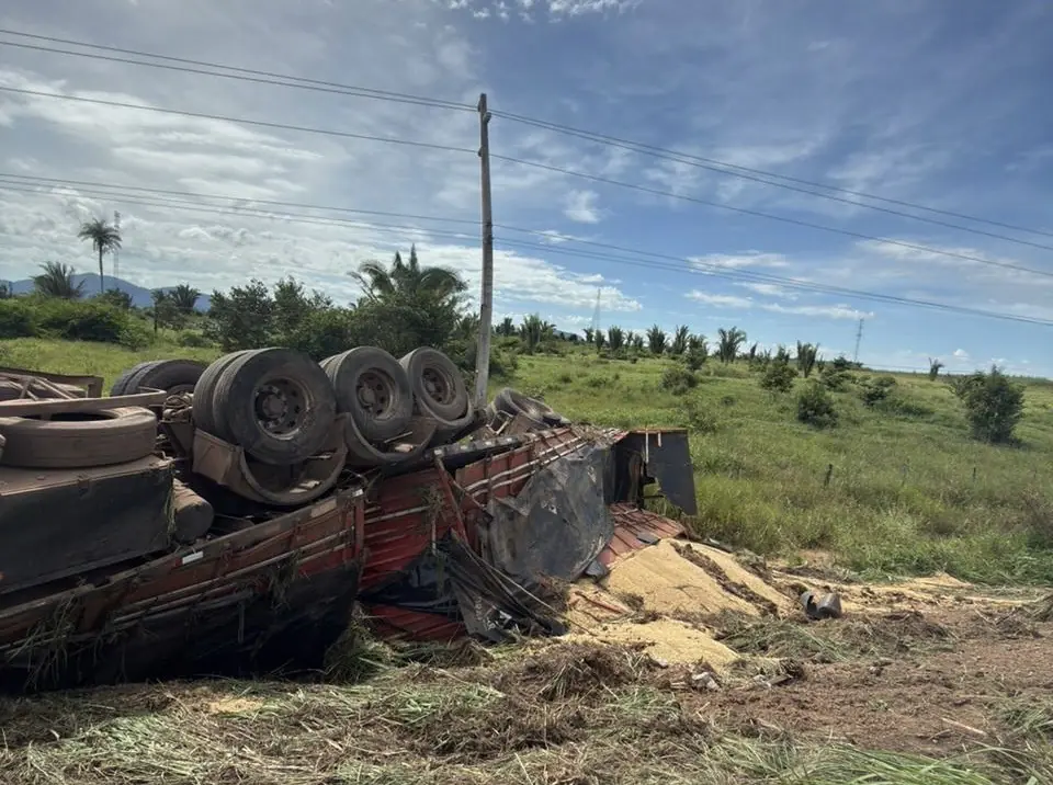 Desvio de buraco termina com carreta tombada na BR-155